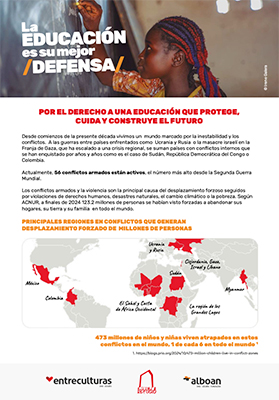 | A través de la campaña Escuela refugio: la educación es su mejor defensa, que hemos construido junto a Alboan, queremos reivindicar la importancia del derecho a la educación para los niños y niñas en contextos de conflicto. La escuela representa un espacio protector donde no solo adquieren conocimientos y competencias, sino también donde pueden recuperarse de los traumas sufridos y se encuentran a salvo de la violencia, la explotación y el reclutamiento militar. |