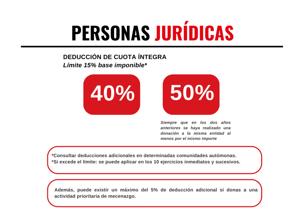 Concretamente, en el Impuesto de Sociedades para Personas Jurídicas la deducción será del 40% sobre las cuotas del donativo.