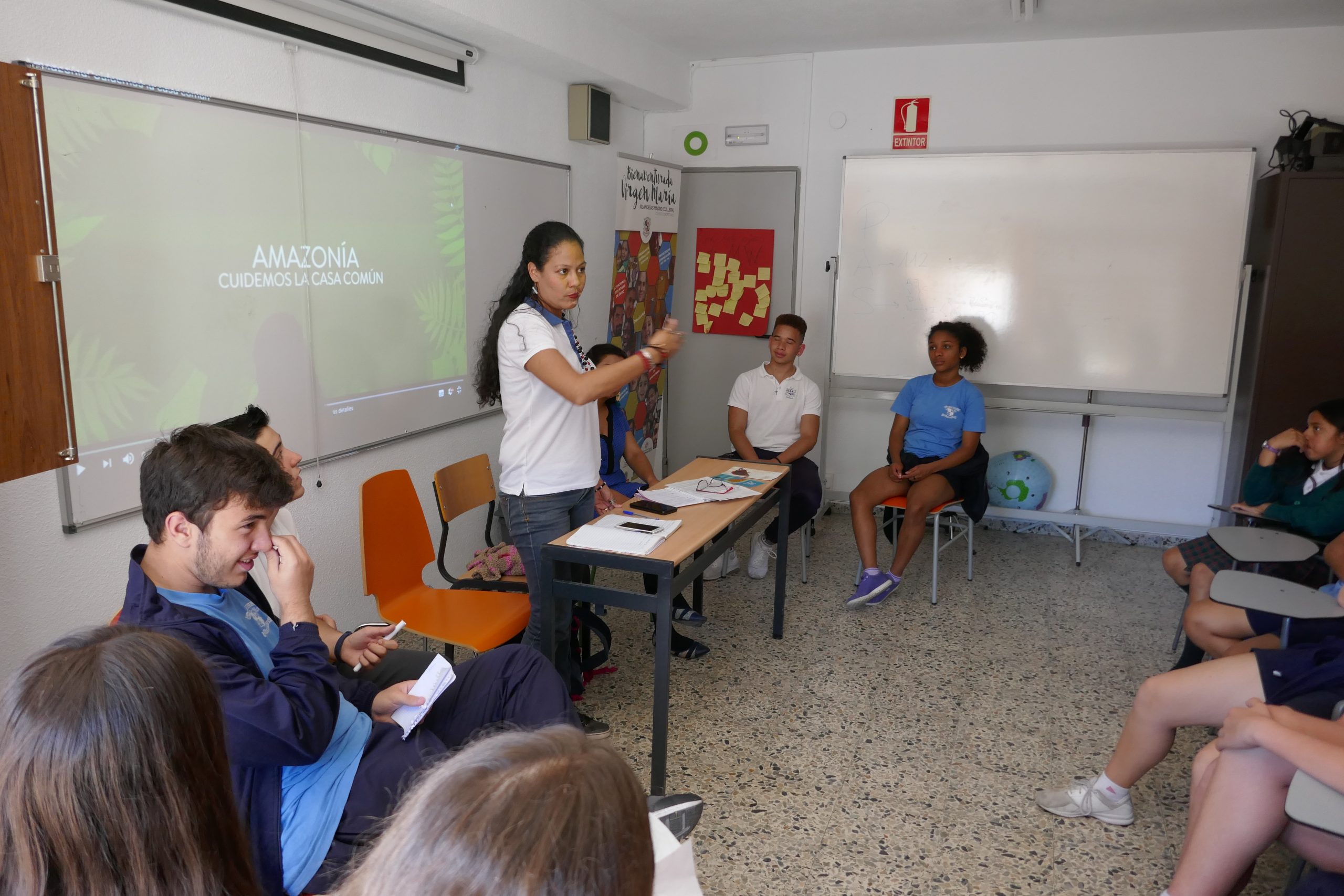 Además, compartieron su trabajo de defensa del medioambiente y de los territorios indígenas con un grupo de 60 estudiantes de 3º de E.S.O. en el colegio Bienaventurada Virgen María de Madrid. Las y los estudiantes prepararon un formato de radio en el que entrevistaron y dialogaron de manera cercana con María Teresa y Elluz, quienes a su vez se interesaron por aprender del proyecto de aprendizaje-servicio que ha estado llevando a cabo el alumnado sobre las migraciones forzosas en el mundo. De esta forma, reflexionaron en conjunto sobre cómo el cambio climático, la sobreexplotación de recursos y la degradación medioambiental están haciendo migrar forzosamente a miles de personas en el mundo. Elluz y María Teresa nos contaron en concreto cómo el daño de la Amazonía está obligando a muchas comunidades indígenas y locales a desplazarse, y por ello el proyecto busca defender a ambos por igual.